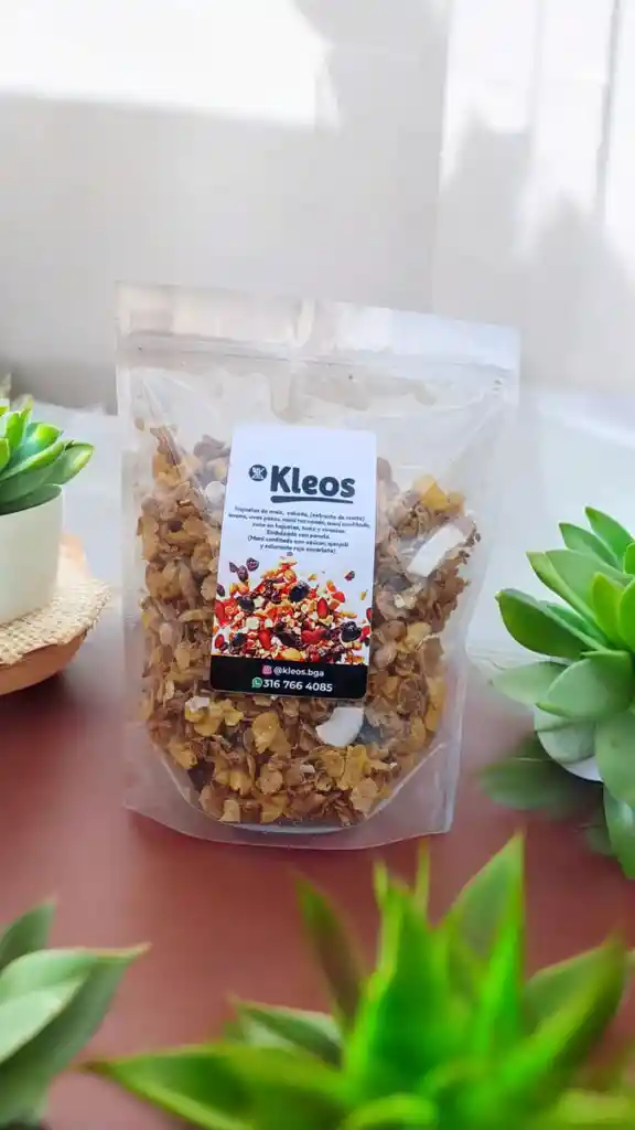granola natural con: hojuelas de maiz, cebada, avena, uvas pasas, maní horneado, maní confitado, coco en hojuelas, nuez y ciruelas.