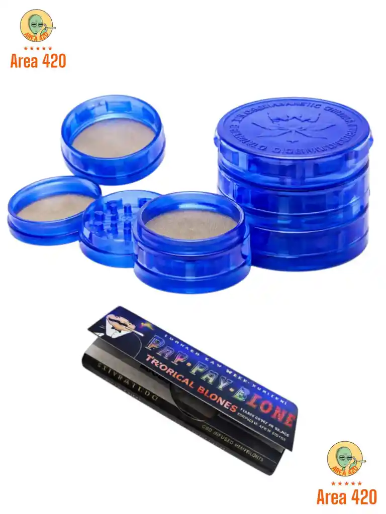 El grinder cuenta con varias partes para triturar de forma eficiente, mientras que los blones incluidos completan el combo para una experiencia práctica y rápida.