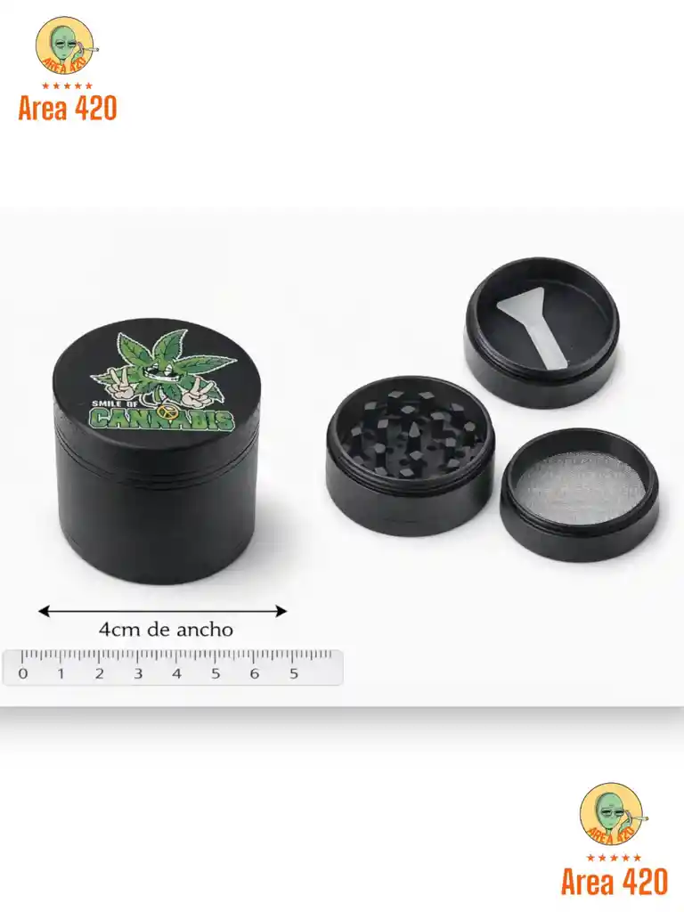 Grinder Trillador Fabricado en material resistente, cuenta con 3 partes que permiten triturar de manera eficiente. Su tamaño de 4 cm lo hace perfecto para llevar a cualquier lado.