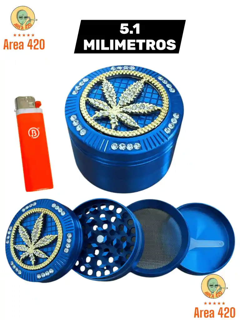 Grinder metálico de 51 mm con diseño diamantado , resistente y de varias piezas para un molido uniforme. Incluye candela. Ideal para llevar y usar con comodidad.