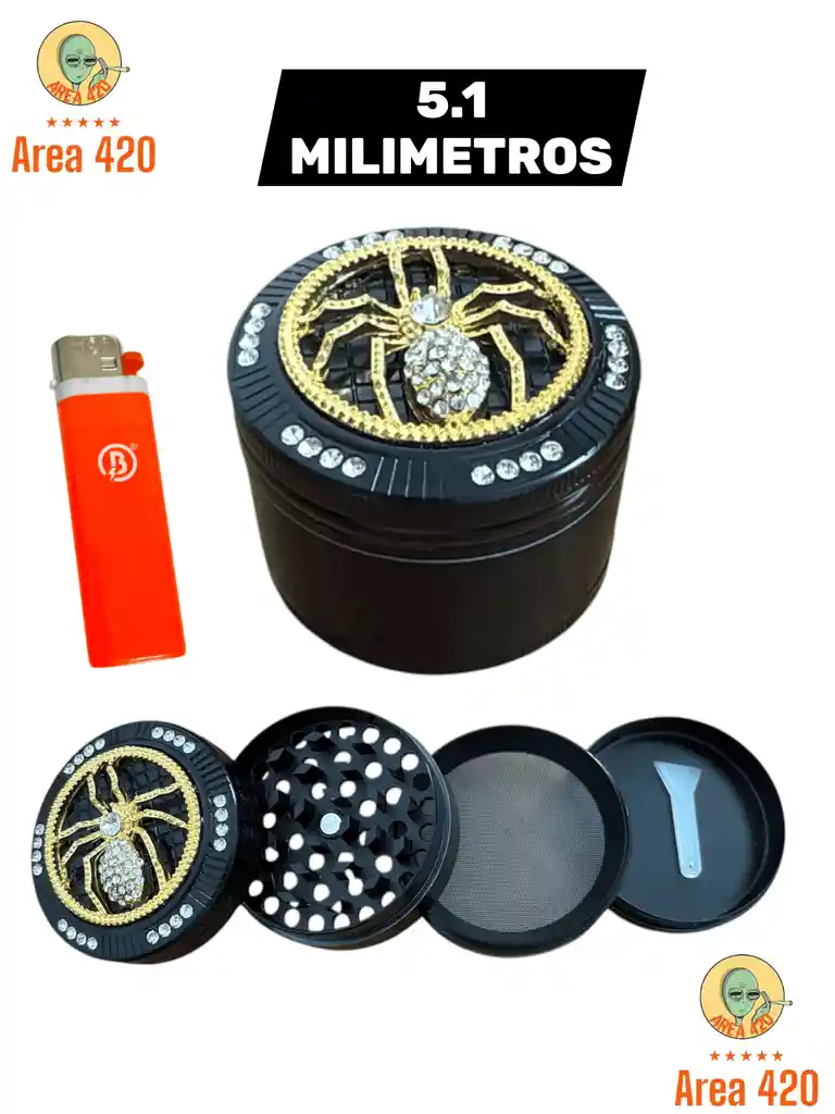 Grinder metálico de 51 mm con diseño diamantado , resistente y de varias piezas para un molido uniforme. Incluye candela. Ideal para llevar y usar con comodidad.