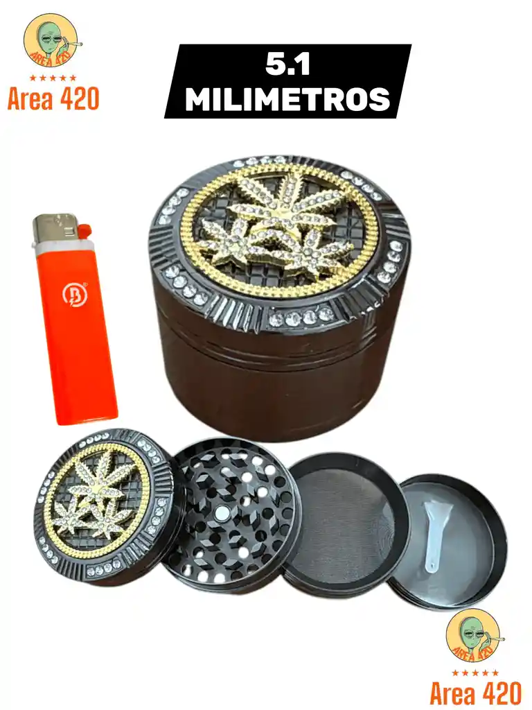 Grinder metálico de 51 mm con diseño diamantado , resistente y de varias piezas para un molido uniforme. Incluye candela. Ideal para llevar y usar con comodidad.