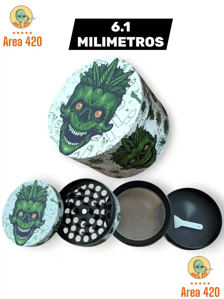 Grinder metálico de 61 mm con diseño metalico, resistente y de varias piezas para un molido uniforme. Incluye candela. Ideal para llevar y usar con comodidad.