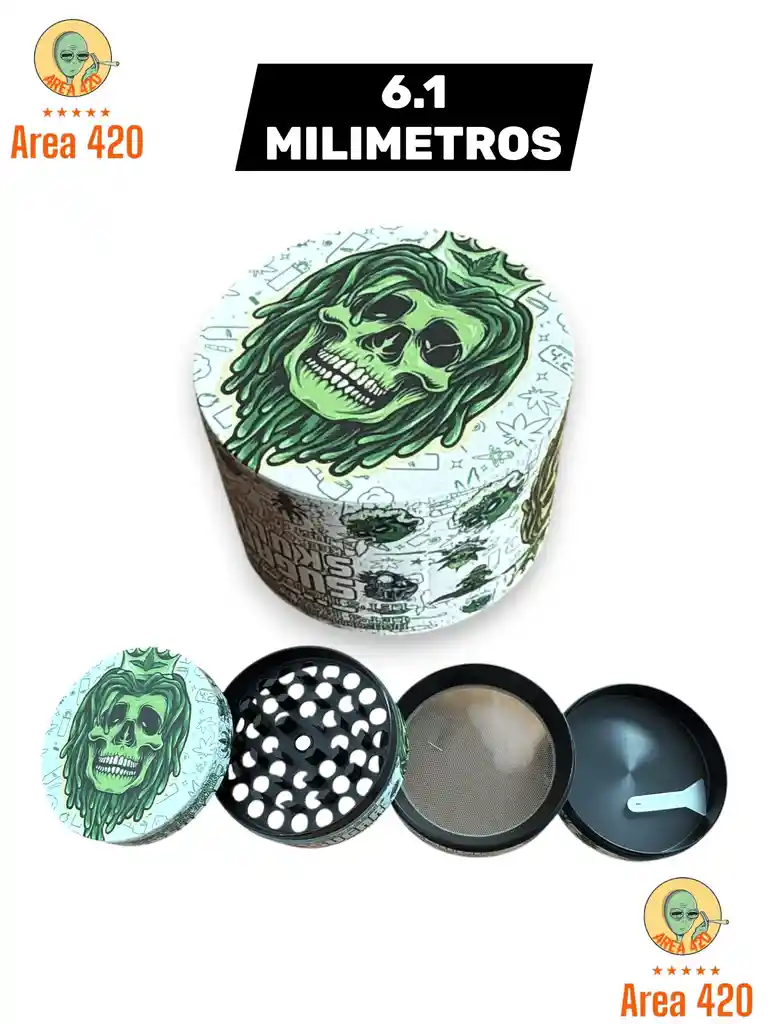 Grinder metálico de 61 mm con diseño metalico, resistente y de varias piezas para un molido uniforme. Incluye candela. Ideal para llevar y usar con comodidad.
