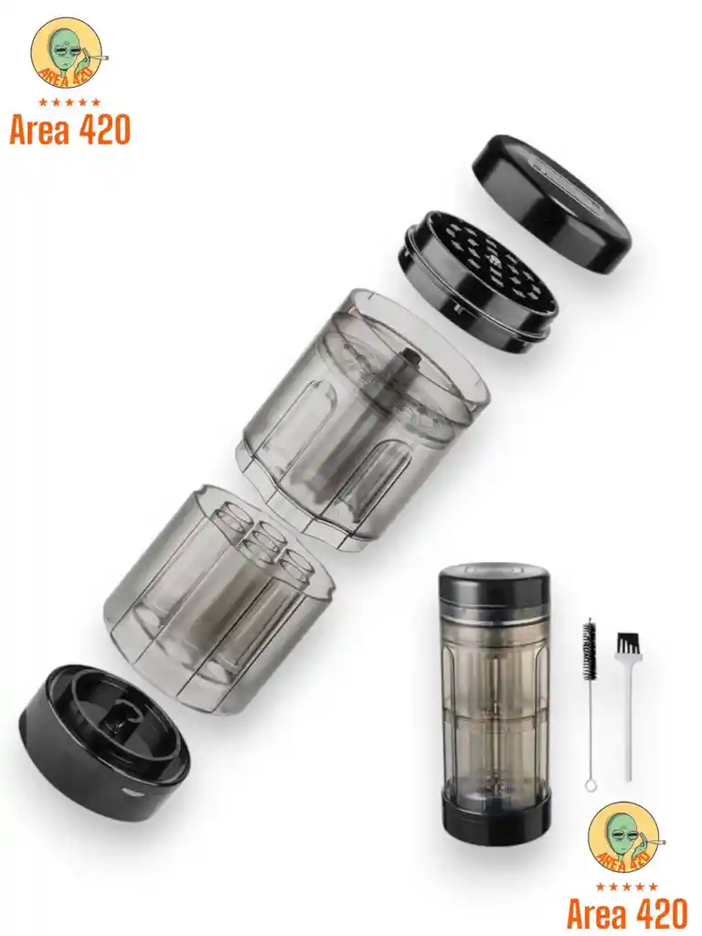 Rallador para rappy Area 420, diseñado para desmenuzar rappy de forma rápida y uniforme, con cuerpo cilíndrico transparente que permite ver el contenido mientras se usa. Su sistema interno tritura y recolecta el material de manera ordenada, facilitando su manipulación y manteniéndolo limpio. Incluye herramientas de limpieza para un uso práctico y cómodo en el día a día.