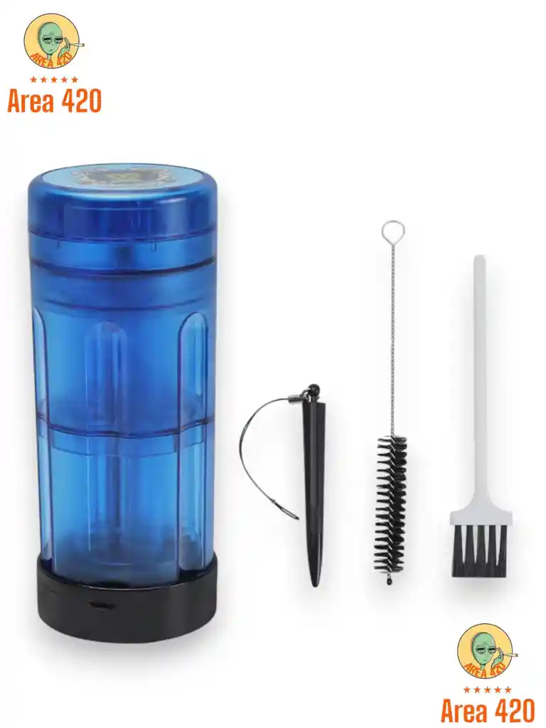 Rallador para rappy Area 420, diseñado para desmenuzar rappy de forma rápida y uniforme, con cuerpo cilíndrico transparente que permite ver el contenido mientras se usa. Su sistema interno tritura y recolecta el material de manera ordenada, facilitando su manipulación y manteniéndolo limpio. Incluye herramientas de limpieza para un uso práctico y cómodo en el día a día.