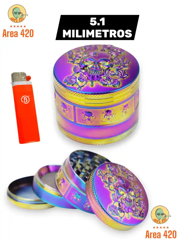Grinder metálico de 51 mm con diseño diamantado , resistente y de varias piezas para un molido uniforme. Incluye candela. Ideal para llevar y usar con comodidad.