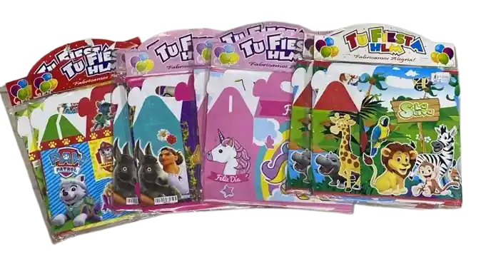 Grupo de cajas de cumpleaños. Incluye 8 paquetes de cajas. Cada paquete contiene 6 cajas. Incluye: Paw Patrol (2) Encanto (2) Feliz Dia (2) La Selva (2)