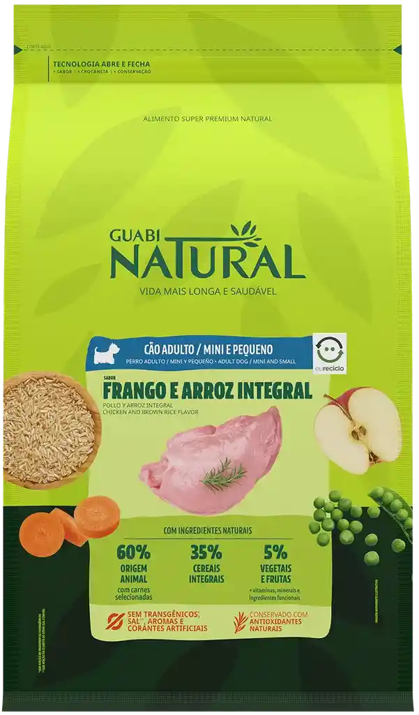 Guabi Natural Alimento para Perros Adultos de Razas Mini y Pequeñas, con su exquisito sabor a Pollo y Arroz Integral, ofrece una nutrición completa y equilibrada para tu mascota. Libre de transgénicos, sal, sabores y colorantes artificiales, y conservado con antioxidantes naturales para garantizar su frescura. Con proteínas de calidad, omegas 6/3 y antioxidantes provenientes de verduras y frutas, promueve una piel y pelaje saludables y contribuye a una vida más larga. Los cereales integrales, fibra y prebióticos aseguran una digestión óptima y heces firmes, mientras que el extracto de yuca reduce el olor de las heces. Además, ayuda a mantener una buena salud dental al reducir la formación de sarro. Confía en Guabi Natural para el bienestar integral de tu perro