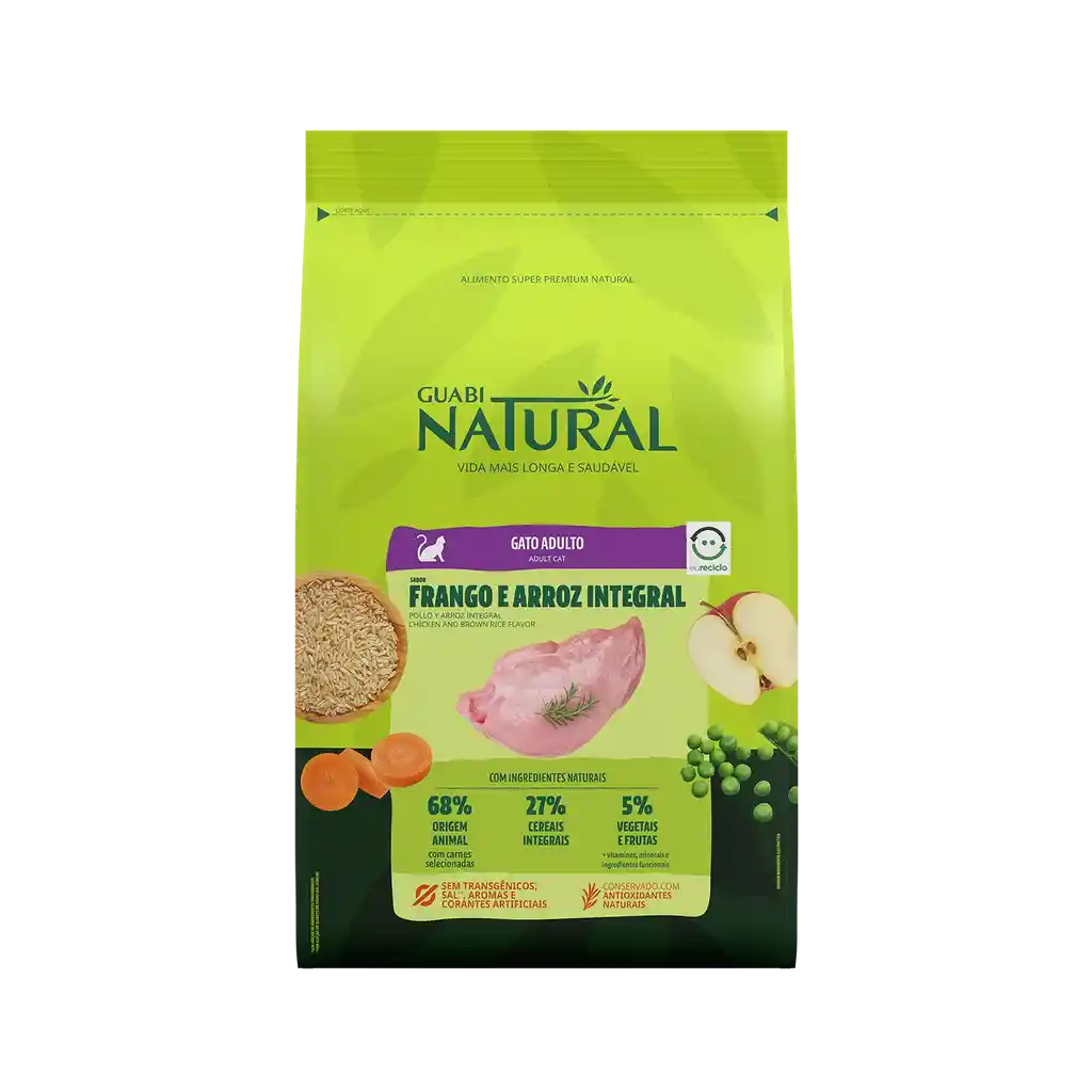 Guabi Natural Gato Senior Castrado Sabor Pollo Arroz Integral Granplus presenta su Alimento para Gatos Adultos Castrado con exquisito sabor a Pollo y Arroz Integral. Nuestra misión es ofrecer alimentos con todos los nutrientes que tu mascota necesita para tener una vida más larga y saludable. Con nuestro conocimiento en nutrición animal, seleccionamos y combinamos los mejores ingredientes de la naturaleza, monitoreando cada etapa de preparación desde su origen, para ofrecerte a ti y a tu mascota alimentos con calidad y seguridad en los que puedes confiar. Libre de transgénicos, sal, sabores y colorantes artificiales, conservado con antioxidantes naturales. Carnes seleccionadas: Con una alta cantidad de carnes seleccionadas de alta palatabilidad y que, combinadas con ricas fuentes de omegas 6/3, contribuyen a una piel y pelaje más sanos. Verduras y frutas: Con verduras y frutas seleccionadas y enriquecidas con antioxidantes que contribuyen a una vida más larga y saludable. Cereales integrales: Con granos enteros, fibras y prebióticos que ayudan en la salud intestinal y la correcta formación de heces. Apoya el peso corporal adecuado: Cuidadosamente desarrollado y enriquecido con ingredientes funcionales para satisfacer las necesidades del metabolismo del gato castrado. Contribuye a la salud urinaria: con cantidades equilibradas de minerales y con control del pH para apoyar la salud del tracto urinario Conoce más Fórmula del Alimento para gatitos 🐱🌿 Vitamina A 15400UI, Vitamina D3 447UI, Vitamina E 600UI, Vitamina K3 0,1mg, Vitamina C 200mg, Vitamina B1 9mg, Vitamina B2 5,1mg, Vitamina B6 4mg, Vitamina B12 29μg, Pantotenato de Calcio 9,3mg, Ácido Fólico 1,2mg, Ácido Nicotínico 51mg, Biotina 0,11mg, Colina 1430mg, Zinc 83mg, Hierro 88mg, Manganeso 11mg, Yodo 2mg, Selenio 0,33mg, Cobre 11mg.