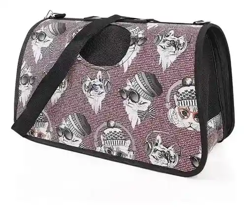 Este bolso transportador para mascotas, con un estampado de alpacas y cactus, es ideal para perros pequeños y gatos. Se conoce comúnmente como guacal de tela o bolso transportador, y está diseñado para ser ligero, plegable y con ventilación adecuada.Diseño: Estampado colorido de alpacas y cactus en fondo gris. Material: Generalmente fabricado en tela resistente e impermeable. Portabilidad: Incluye una correa larga ajustable para el hombro y una manija superior para llevarlo en la mano. Ventilación: Cuenta con mallas laterales y frontales para permitir la circulación de aire. Dimensiones comunes: En su talla L suele medir aproximadamente 52 cm x 32 cm x 22 cm.