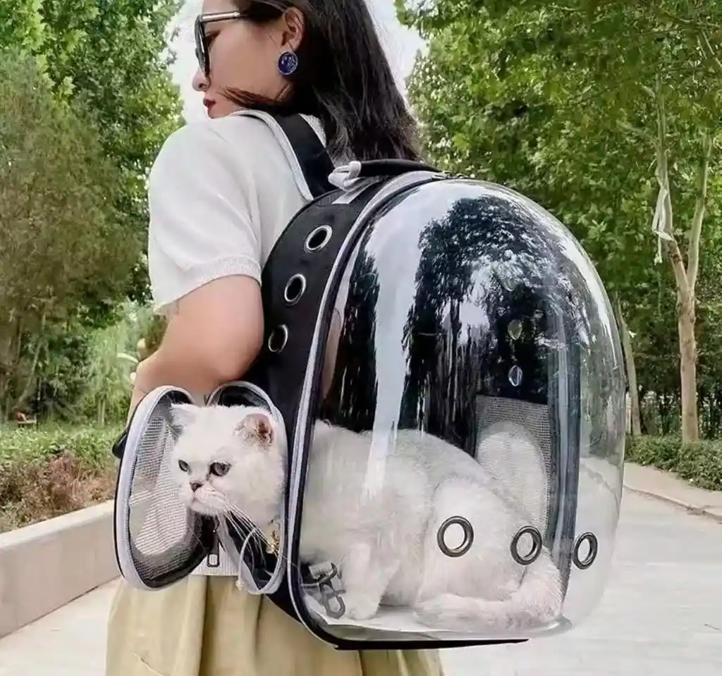 Color D transportador de mascotas, específicamente un morral para gatos o perros pequeños, con un diseño de cápsula espacial transparente. Características principales: Diseño: Cuenta con un domo transparente de PVC en la parte delantera que permite a la mascota tener una vista panorámica del exterior, y una malla transpirable en los laterales para una ventilación adecuada. Materiales: Generalmente está fabricada con loneta Oxford resistente e impermeable y PVC transparente, lo que la hace duradera y fácil de limpiar. Comodidad y Seguridad: Incorpora correas de hombro anchas, ajustables y acolchadas para la comodidad del portador, y a menudo incluye una correa de seguridad interna para sujetar a la mascota y evitar escapes. Funcionalidad: Puede incluir bolsillos laterales para almacenar accesorios como botellas de agua o golosinas, y algunos modelos tienen una entrada lateral adicional para facilitar la entrada y salida de la mascota. isponible: Negro con gris claro