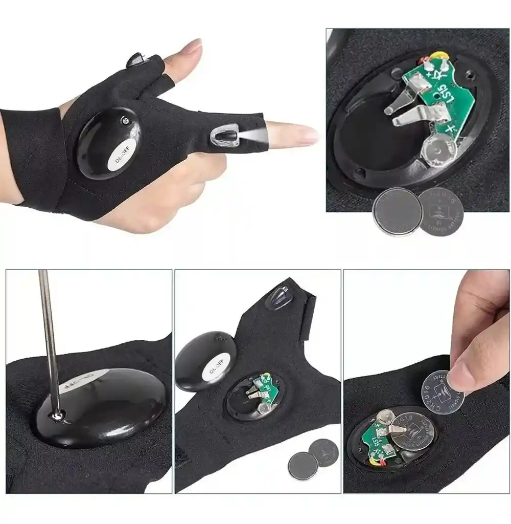 - Cómodo de llevar sin sensación de restricción, puede usar otros guantes dentro de él cuando está frío. Material ligero, transpirable y flexible que es duradero. - Fácil de reemplazar la batería: utiliza un destornillador para aflojar un tornillo para reemplazar la batería. - Múltiples usos: Perfecto para cada actividad y trabajo de luz necesaria. Aprovecha al máximo la vida cotidiana con guantes. - Pesca, para reemplazar el anzuelo cuando la pesca nocturna. - Ayuda práctica cuando falta de luz. - Equipo de mantenimiento o reparación, un mejor ayudante cuando se hace con piezas finas. CARACTERÍSTICAS: * Material: Tela, plástico. * Tamaño Aprox.: 31.5 x 4.7 x 10 cm aprox. * Peso producto: 19 g aprox. * Tamaño: talla única (material elástico) * Tiene un diseño ambidiestro que se adapta tanto a la mano izquierda como a la derecha. * Fácil de encender y apagar. * Requiere 2 baterías tipo botón CR2016 * Es muy útil cuando no hay nadie que sostenga la luz por ti. * La luz LED brillante se fija en la punta de los dedos índice y el pulgar. * La batería puede ser reemplazada por usted mismo cuando retire el tornillo en la parte plástica. * Tela flexible: el material liviano y cómodo te hace sentir suave y se adapta perfectamente a tu mano. * El velcro ajustable puede estirarse para adaptarse incluso a manos grandes.