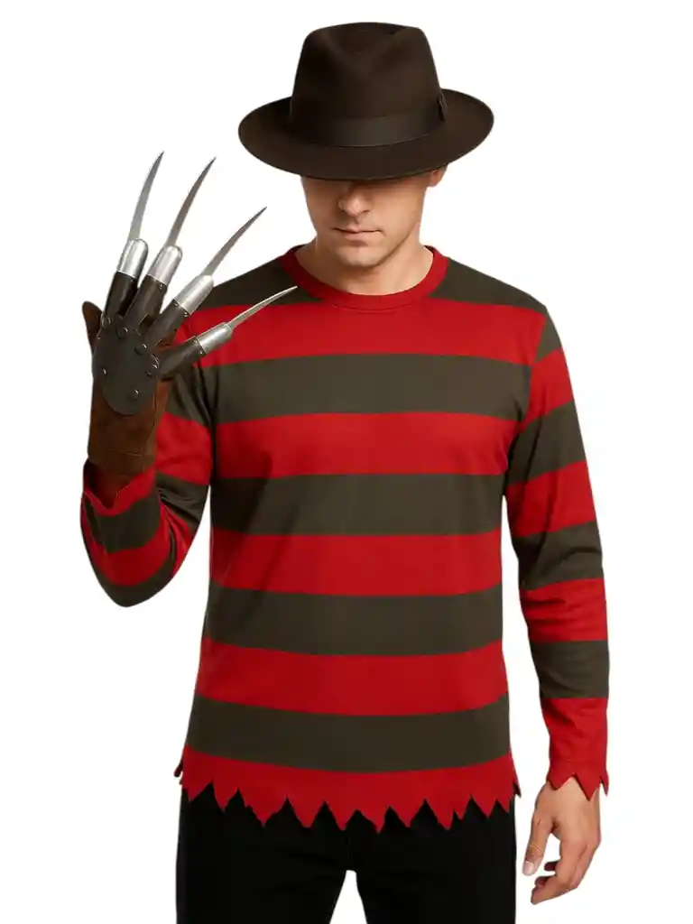 guante de freddy krueger color cafe con gris materiales de plastico y sintetico para adulto o niño largo de 30 cm aproximados ancho de 11 cm camisa de freddy color rojo con gris largo de 70 cm ancho de 49 cm material de tela talla unica si deseas algo adicional indicanos