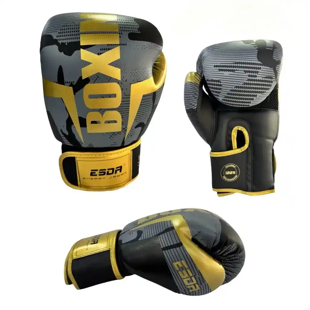 SKU: AM032-DR-12ONZ Código: ed-zb43veg-12oz Talla: 12 Onzas Color: camuflado negro/gris dorado Espuma aglomerada EVA. Superficie en PU. Ajuste de muñeca en velcro. Mallado en la palma. Color: Negro / dorado Marca: Esda sport