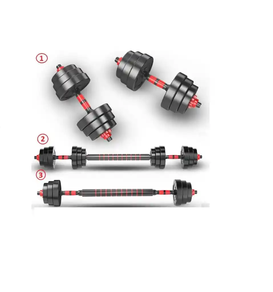 Te presentamos nuestro set de mancuernas de 20 KG con barra ergonómica y cierres en forma de estrella. PODRÁS TENER: • Un entrenamiento profesional de pesas en casa. • Barras de pesas sólidas con una unión para convertir las 2 mancuernas en una barra larga y poder trabajar otros músculos. • Superficies de agarre antideslizantes de aprox. 40 cm cada una. • Cierres de rosca/cierres de estrella con anillos plásticos para asegurar que los discos de pesas estén siempre firmemente unidos a las barras. • Asas antideslizantes - esto evitará que las manos se deslicen durante el entrenamiento. Cada una de las barras tienen dos roscas trapeciales robustas (para una fijación segura de los discos) • Discos de pesas termo forrados en plástico para proteger el suelo y la integridad estructural del disco (de esta manera, se evita también el ruido molesto cuando las pesas son puestas en el suelo). En total son 12 discos, TODO SUMA 20KG. 4 Discos de 2 KG 4 Discos de 1.5 KG 4 Discos de 1.25 KG 4 Seguros de Estrella 2 Mancuernas Antideslizantes (barras cortas, que juntas forman de 30- 35 cm APROXIMADAMENTE) + la barra conectora larga APROX de 50 cm. Todo mediría de 80-90 cms APROX (Pesa 1 kg)