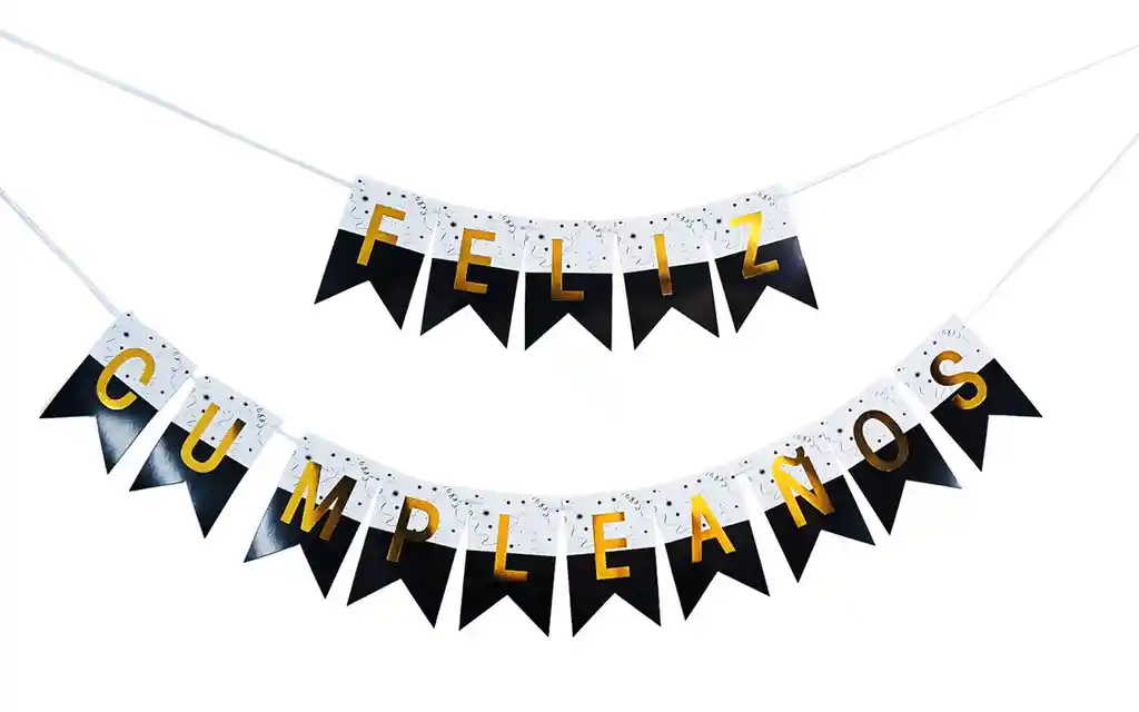 Adorno de techo o pared negro y blanco, consistente en una tira de banderines con el mensaje de “Feliz cumpleaños”, viene con su respectiva cinta. Hecho en carton y con diseños elegantes.