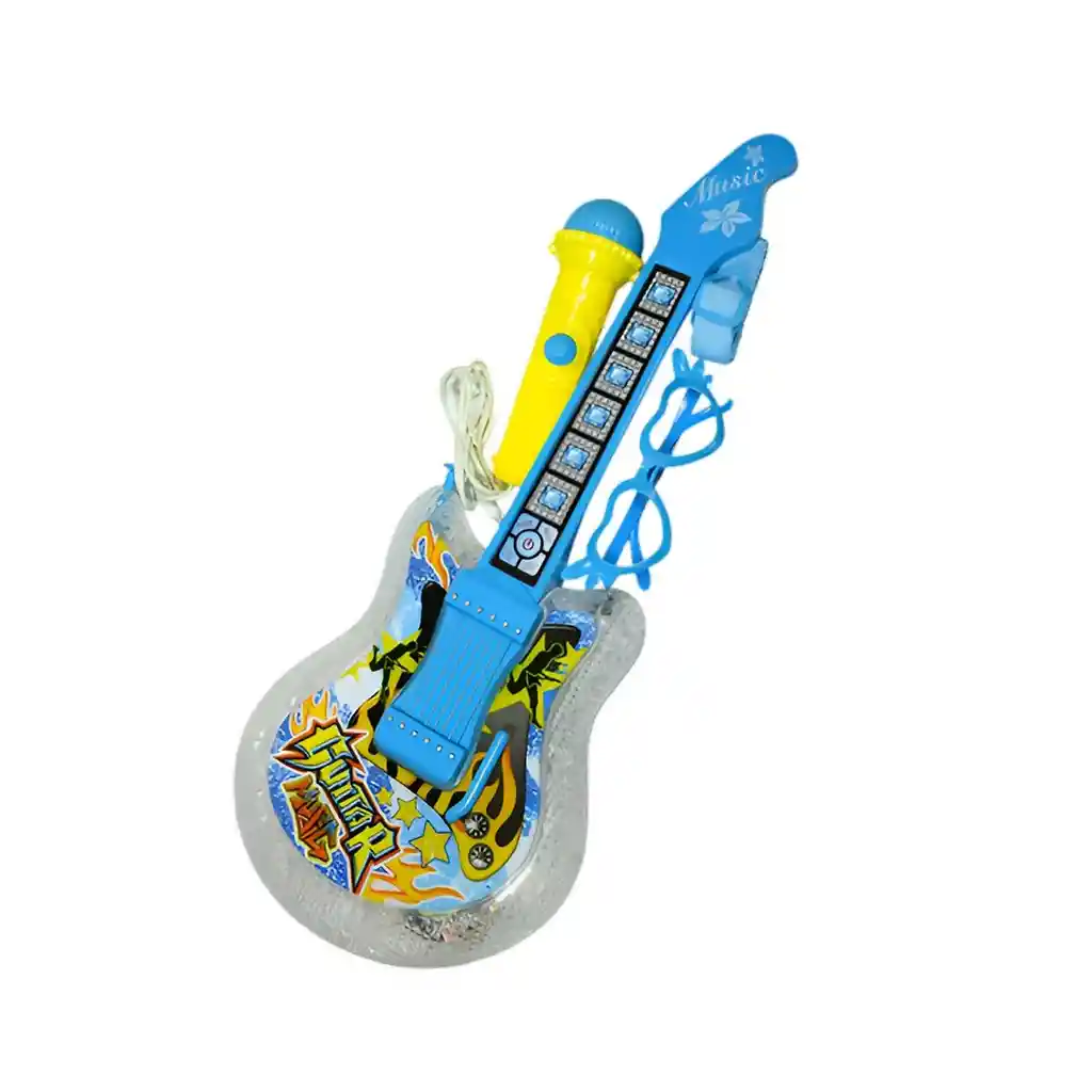 ¡Es hora de subir el volumen y robarse el show con nuestro increíble set de Guitarra Eléctrica Rock Star! Este no es solo un juguete, es un boleto directo al estrellato para tu pequeño músico, que incluye todo lo necesario para su primer gran concierto: una guitarra con un diseño espectacular, un micrófono para cantar sus éxitos y unas gafas de sol para completar el look de una verdadera estrella de rock. Al tocar, la guitarra cobra vida con un deslumbrante espectáculo de luces de colores que parpadean y bailan al ritmo de las melodías pregrabadas, creando una auténtica atmósfera de concierto en cualquier habitación. Es el regalo perfecto para inspirar la creatividad, desarrollar el talento musical y convertir cada día en una inolvidable gira mundial llena de música y diversión. /// El juguete incluye baterías /// Ficha Técnica: Dimensiones : 47 cm x 19 cm x 4 cm Funcionamiento: 3 Baterías AA Material: Plástico ABS Edad Apta : + 3 años Certificado de conformidad: SL-CS-210044 Referencia: 8983 ** _Para defectos de fábrica o retractos: \_Por favor revise el producto apenas lo reciba y antes de usarlo. No aplican ley de retracto o defectos de fábrica luego de usar el producto. Se manejan máximo 5 días para reportar defectos de fábrica (por ejemplo, producto funciona mal, piezas faltantes, rotas, etc). Para hacer efectiva la devolución el producto debe devolverse con el empaque original, el cual debe estar en buen estado, incluir todos los documentos y las partes completas y sin daños.