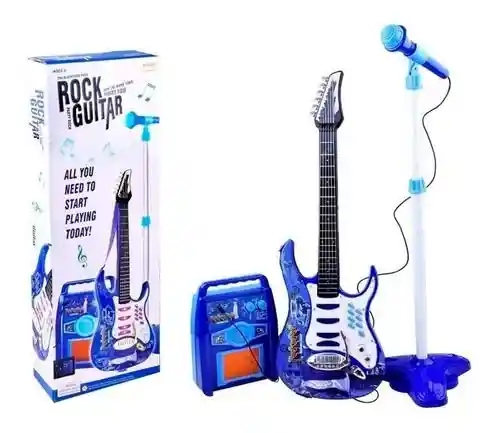 Guitarra Eléctrica de juguete manos libres, con Amplificador de sonido y Micrófono con base para mayor estabilidad de los Niños. -Características: - Desarrolla la creatividad y diversión de los pequeños cantantes y artistas, con esta sensacional guitarra que cuenta con amplificador de 4 ritmos y 6 teclas. - Es un set completo de música con sonidos al oprimir 2 cuerdas simultáneamente, en el amplificador controlas el volumen de la guitarra y el micrófono es independientemente. El amplificador tiene entrada para mp3 por plug de 3,5mm La guitarra utiliza 4 pilas AA (no incluidas) - El amplificador utiliza 3 pilas AA (no incluidas) Tanto el amplificador como la guitarra tienen luces - El micrófono funciona de verdad Teclas de música 1-6 botones para la conversión de música diferente - Botón de demostración de música. Suena continuamente seis canciones - Botón Detener - 2 modos - Cuatro luces intermitentes - Recomendar edad de 3 a 6 años - Altavoz - Perilla A para el interruptor de encendido y el control de volumen de la guitarra - Perilla B para el micrófono y el control de volumen MP3 - MP3 - Medidas de Guitarra Alto 72 cm - Peso 8,9 kg. -Colores Azul