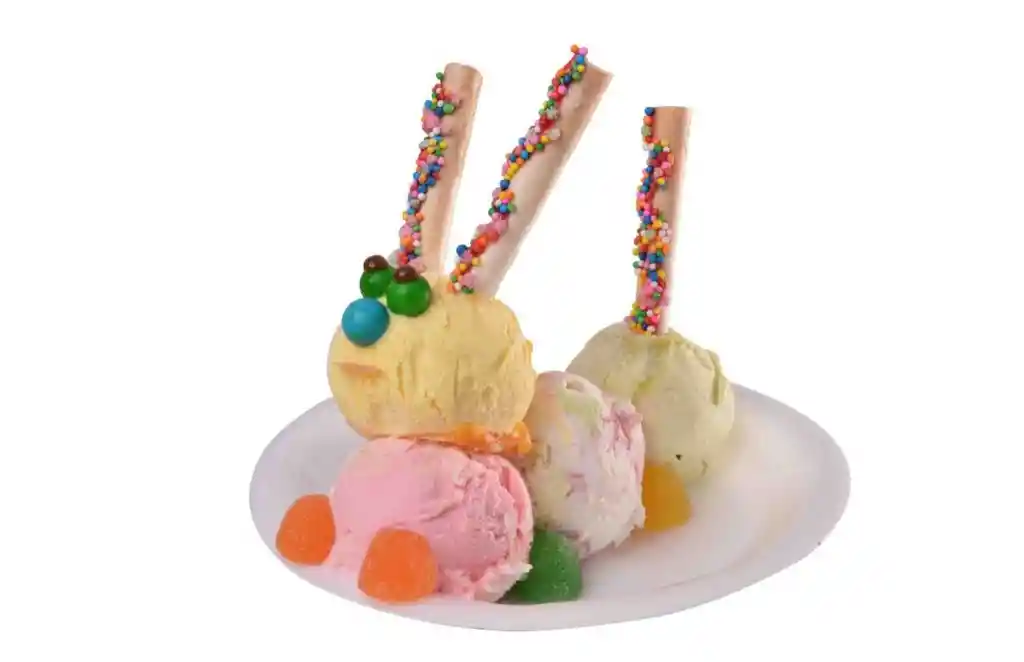 cuatro sabores de helado, acompañados de gomas, grajeas de colores, barquillo y una sombrillo. Acompañado de un juguete de sorpresa.