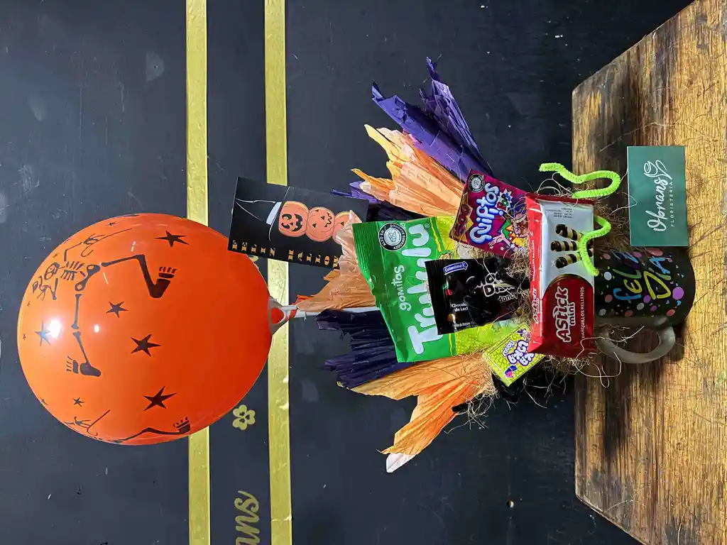 Base e vaso de porcelana, con dulces y decoración de Halloween