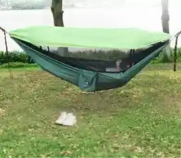 Material: Nylon Tamaño producto: 140 x 220 cm Peso Aprox.: 659 g. Una hamaca cómoda para relajarse que es lo suficientemente grande como para apoyar a 2 personas (carga máxima de 200 kg aprox.) Diseño duradero y a prueba de suciedad. Forma plegable y portátil con red mosquitero incluida en su diseño. Los anillos resistentes le ayudan a atar la hamaca con seguridad en árboles. Viene con una bolsa de transporte para guardar su hamaca con facilidad, o llevarla donde quiera. La bolsa está pegada a la hamaca lo que la hace ideal para guardar objetos pequeños cuando se saque la hamaca. Al estar la bolsa pegada en la hamaca facilita el guardado de la misma. La malla se puede abrir y cerrar fácilmente por medio de cremallera. Con esta hamaca tendrás un descanso pleno y podrás dormir con mucha comodidad.