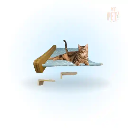Hamaca elevada para gatos, ideal para instalar en pared. Incluye repisas tipo escalera que funcionan como acceso y zona de juego. Estructura firme, tela resistente y medidas aproximadas de 44x32 cm. Ahorra espacio, ofrece comodidad y estimula instinto explorador. Color o diseño sujeto a disponibilidad.