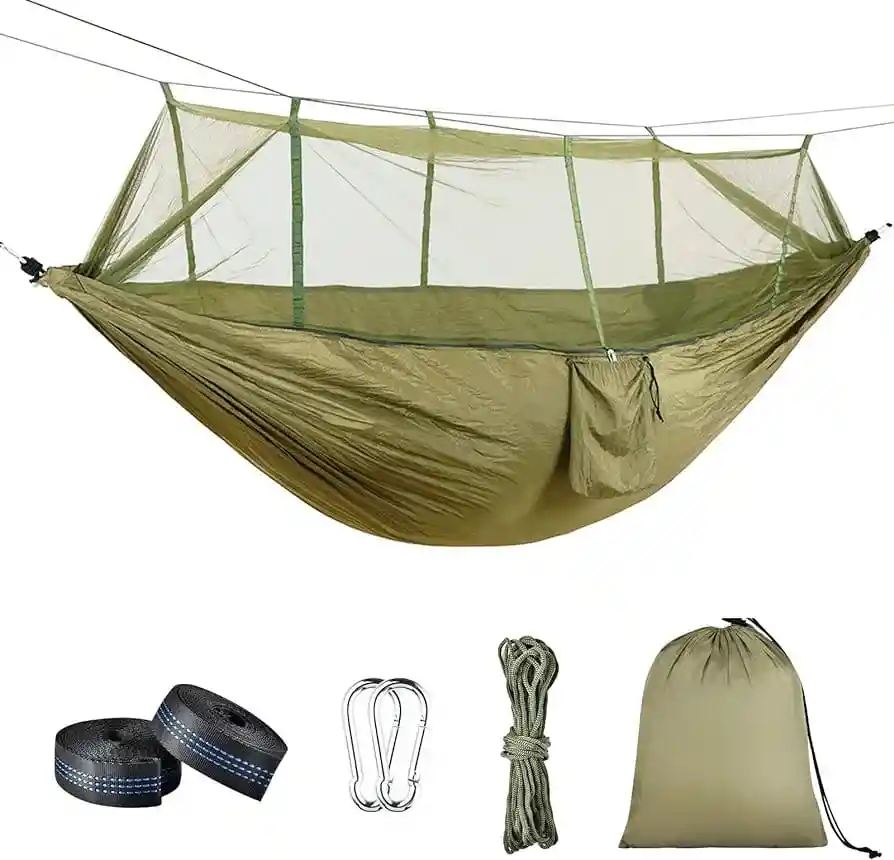 1. Material de la hamaca: hilado de nailon 70D, material de malla: malla de poliéster 2. Especificación: 290 * 140 CM, peso: alrededor de 890 g 3. Soporte de carga: 200 KG 4. Fácil de operar y alta capacidad de carga. 5. Buena dureza, seguridad y estabilidad. 6. Hamaca de apertura rápida automática: colgar se puede abrir automáticamente, mosquiteras y diseño integrado de hamaca, ya no es necesario atar la cuerda de las mosquiteras y problemas. Las mosquiteras de doble uso se pueden voltear para que la tela quede boca arriba directamente cuando no se necesitan mosquiteras. Las mosquiteras se adherirán a la superficie de tela de la hamaca. 7. Configuración: Hebilla de acero dorado negro No. 8 * 2, cinturón de árbol de doble anillo * 2 (2 metros cada uno)
