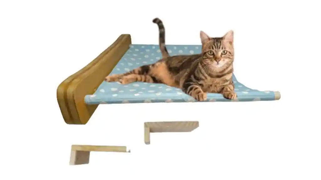Hamaca elevada para gatos, ideal para instalar en pared. Incluye repisas tipo escalera que funcionan como acceso y zona de juego. Estructura firme, tela resistente y medidas aproximadas de 44x32 cm. Ahorra espacio, ofrece comodidad y estimula instinto explorador. Color o diseño sujeto a disponibilidad.