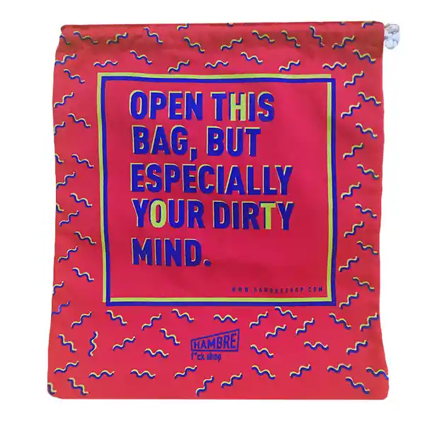 Bolsita Hambre "Open This Bag. But Especially Your Dirty Mind" de Tela Para Tus Juguetes y Preservativos. Impresa en Serigrafía. Para Que Puedas Guardar Todo lo Que te Imagines. Tamaño: Ancho 30 cm y Alto 34 cm.