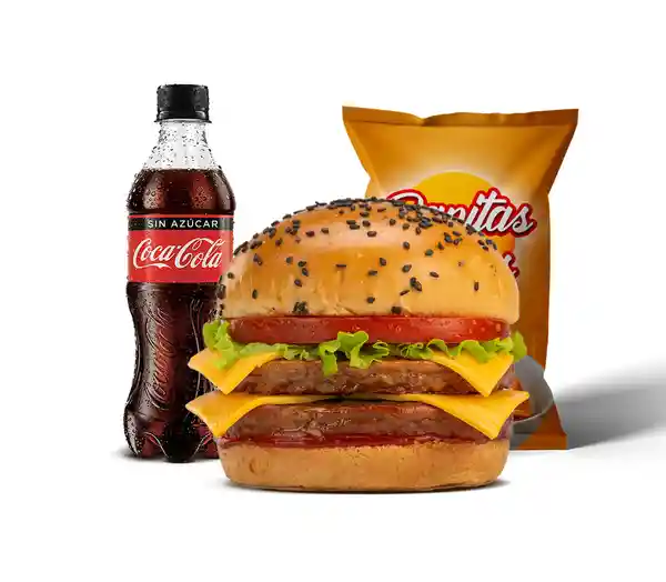 Contiene 3 Unidades. Hamburguesa Doble 1 Und + Coca-Cola Gaseosa Sin Azúcar 1 Und + Papas Pollo 1 Und.