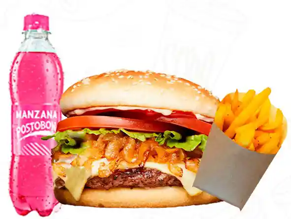 Con Carne de Res, queso, tomate, lechuga, cebolla en guiso y salsas, porción de papa a la francesa y gaseosa postobón 250 ml