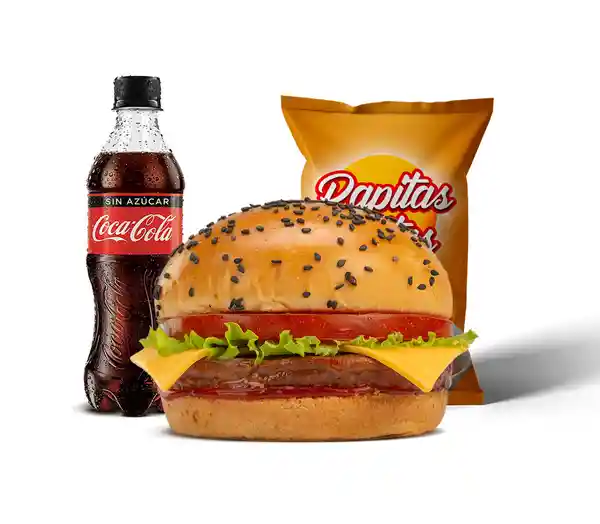 Contiene 3 Unidades. Hamburguesa Queso 1 Und + Coca-Cola Gaseosa Sin Azúcar 1 Und + Papas Pollo 1 Und.
