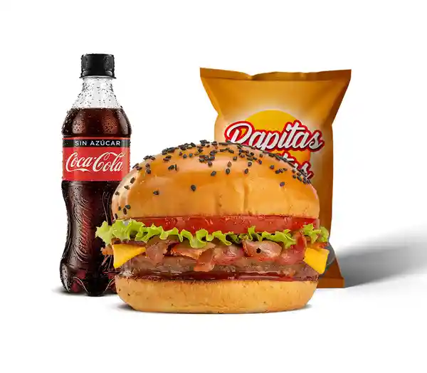 Contiene 3 Unidades. Hamburguesa Queso Tocineta 1 Und + Coca-Cola Gaseosa Sin Azúcar 1 Und + Papas Natural 1 Und.