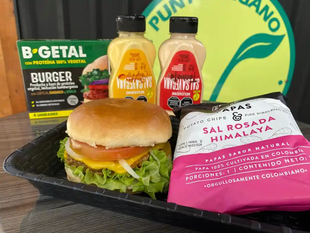 Hamburguesa Vegana con proteína B-Getal, queso Violife (cheddar ó mozzarella), salsas Del Casino (cheddar y/o tocineta) y vegetales (lechuga, cebolla y tomate), incluye papas sal rosada Monterojo 25 g. Apto para veganos, vegan, vegetariano, plant based, libre de ingredientes de origen animal.