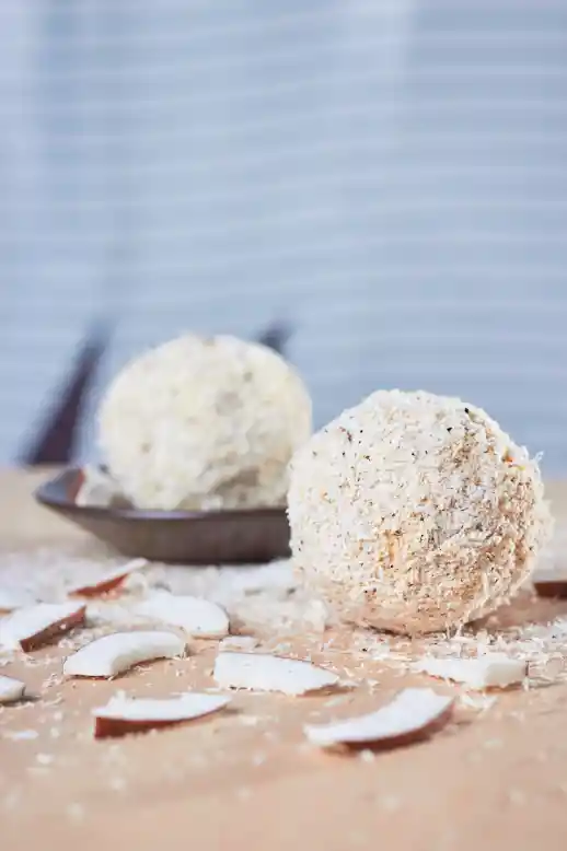 Bola de Mr Happy de vainilla con cubierta crocante de coco.