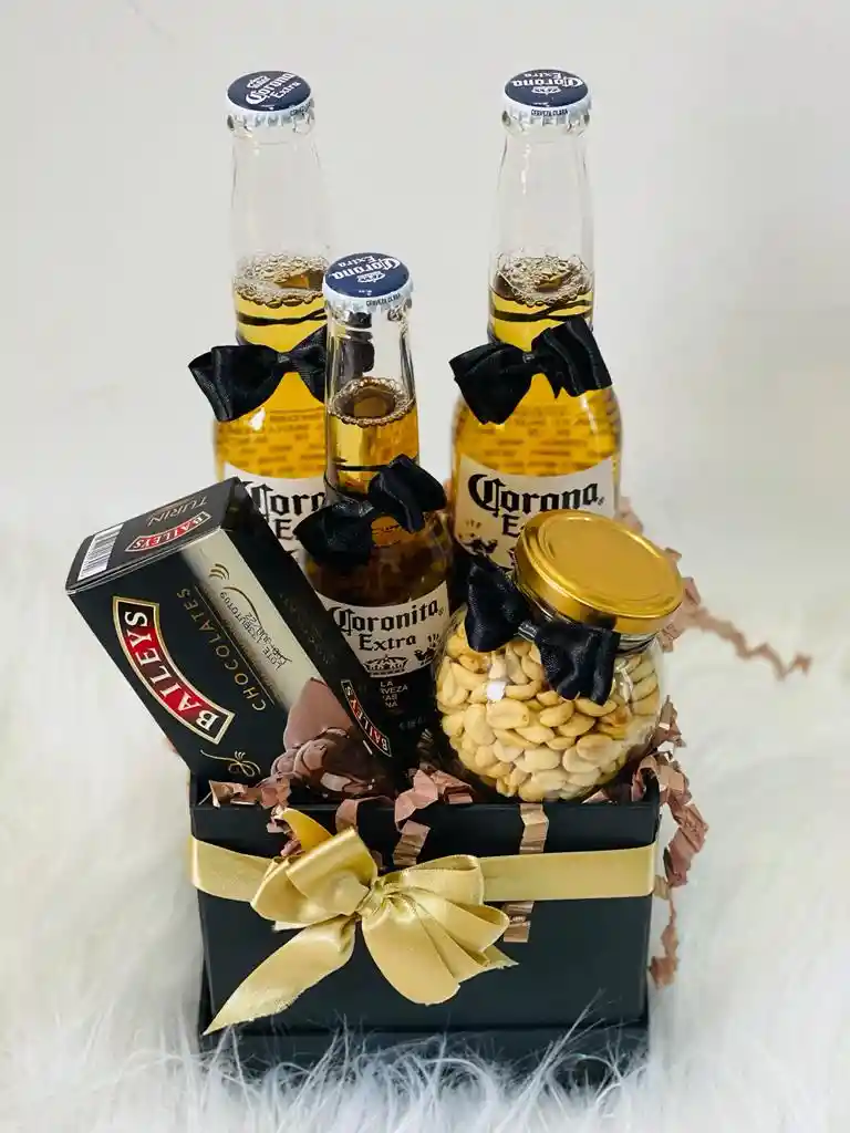 Espectacular caja negra , con 2 coronas y 1 coronita, tarrito de maní y caja de chocolates de bailys. acompañalo con una tarjeta !!