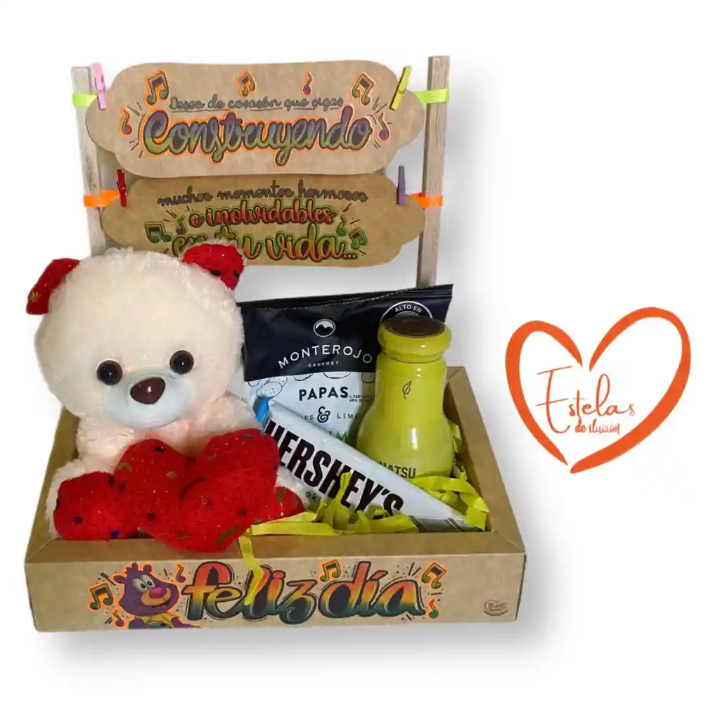Regala éste hermoso detalle a tu persona querida. Contiene un peluche de 20 cm, 1 té Hatsu, 1 chocolatina Hersheys grande y unas papas gorumet Monterojo.