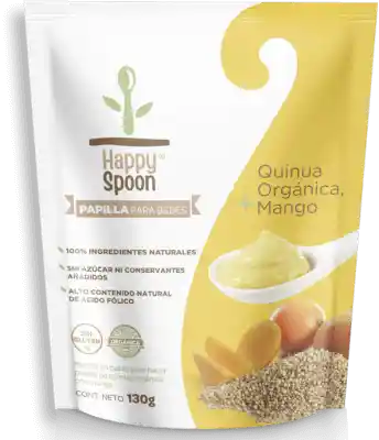 Papilla para bebes con quinua organiza y mango. 100% ingredientes naturales. Din azúcar ni conservantes añadidos. Alto contenido natural de acido fólico. Ideal para consentir a tu pequeño.