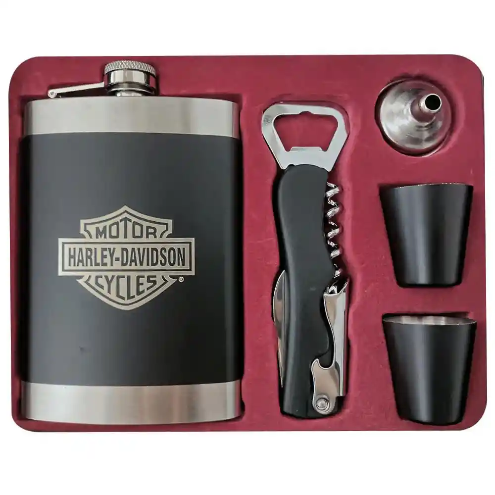 Set Harley-Dayidson Contiene 5 Unidades. Licorera 1 Und Destapador 1 Und + Copas Capacidad 9 Oz 2 Und + Embudo 1 Und.