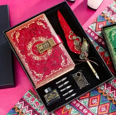 Características: Nuestro Grimorio de Harri Poter viene con cerradura de combinación, que es fácil de operar. Puedes relajarte y escribir libremente. La cubierta del diario está hecha de sintetico y viene con bolígrafo, kits de regalo portátiles. Este diario tiene un papel interior grueso y suave, que no es fácil de rasgar cuando se usa. Está bien encuadernado y es de tamaño moderado, fácil de llevar. El delicado conjunto es un gran Regalo.. Especificaciones: Material: Papel Opciones de color: 5 colores disponibles como se muestra en la imagen. Peso del paquete: aprox. 480 g Tamaño: aprox. 285 x 225 mm/11,22 x 8,85 pulgadas Nota: Permita un error de 1-3 mm debido a la medición manual. Asegúrese de que no le importe antes de ofertar. . ¡Gracias! El paquete incluye: 1 pieza de tinta 4 bolsas de tinta 1 cabezal de pincel de escritura 1 soporte de bolígrafo de metal 1 caja de regalo 1 bolsa de regalo