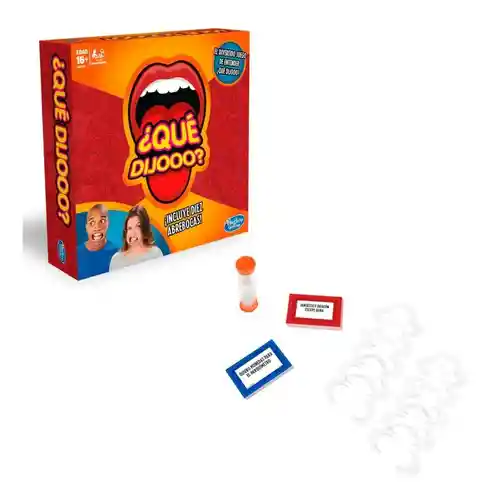 ¿QUÉ DIJOOO? ¡Ahora el hilarante desafío incluye 10 abrebocas con el JUEGO DE MESA ¿QUÉ DIJO? HASBRO! Intenta decir diferentes frases mientras usas el abrebocas que no te permitirá cerrar la boca. Toma una tarjeta de la baraja e intenta leer la frase. Intenta decir frases como “esta es la mascota de mi hermana, Carlota”, “a los chicos les gusta la leche chocolatada”. La risa continúa mientras los jugadores deben adivinar correctamente la frase con el fin de ganar la tarjeta. El juego ¿Qué dijo? incluye: -200 tarjetas dobles -10 accesorios bucales -un temporizador.