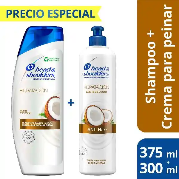 Descubre el poder de Head & Shoulders con aceite de coco, para un pelo hasta 100 % libre de caspa, hidratado, suave, brillante y sin frizz. Su fórmula limpia e hidrata desde la raíz para ayudarte a tener un cuero cabelludo saludable y un cabello hermoso. El pack contiene 1 champú de 375 mL y 1 crema para peinar de 300 mL.