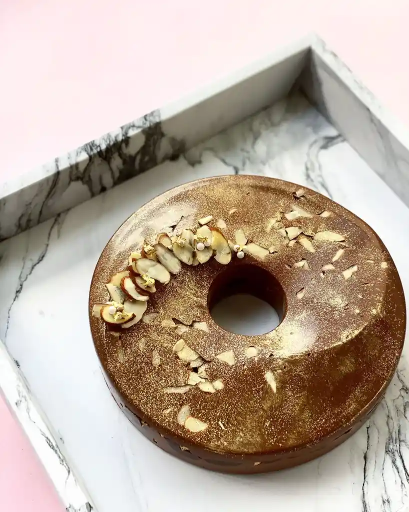 Donut saludable de un mix de chocolate de leche light y chocolate al 70% de cacao con almendras tostadas, pistachos, mantequilla de almendras 100% natural, arequipe de almendras y quinoa pop crujiente. Decorada con láminas de oro de 24 kilates. Medidas: 20 cm de diametro x 4 cm de profundidad. Saludable, almendras, pistachos, mantequilla de maní, mantequilla de almendras, quinoa, light, chocolate amargo