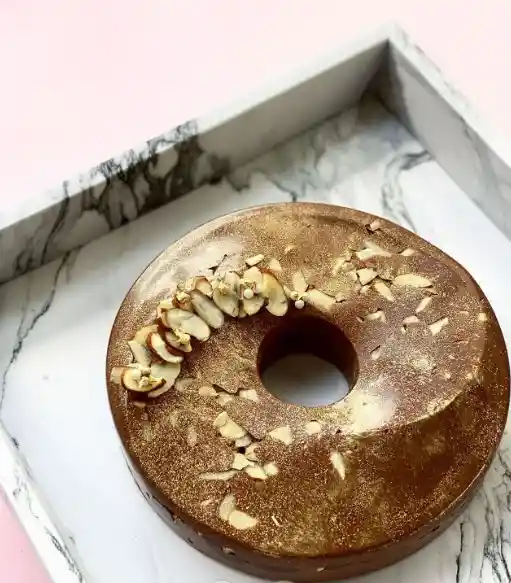 Donut saludable de un mix de chocolate de leche light y chocolate al 70% de cacao con almendras tostadas, pistachos, mantequilla de almendras 100% natural, arequipe de almendras y quinoa pop crujiente. Decorada con láminas de oro de 24 kilates. Medidas: 20 cm de diametro x 4 cm de profundidad. Saludable, almendras, pistachos, mantequilla de maní, mantequilla de almendras, quinoa, light, chocolate amargo