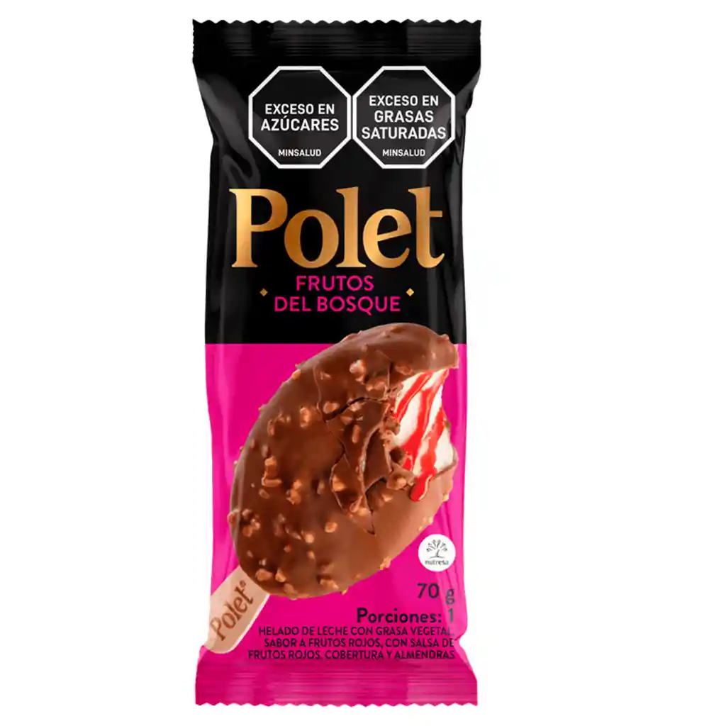 Es un delicioso postre con una crujiente capa de chocolate Polet, trozos de almendra y un cremoso helado de frutos del bosque.