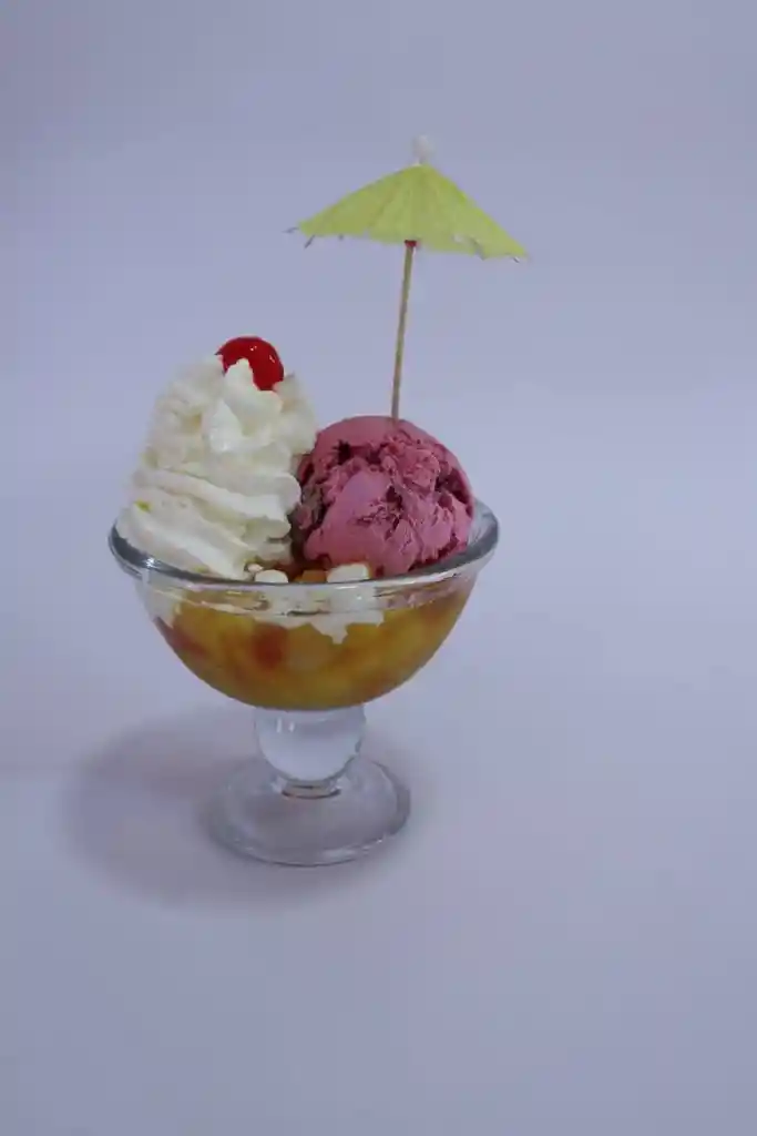 Cóctel de frutas de conserva, bañado en crema de leche, acompañado de un sabor de helado y crema chantilly.