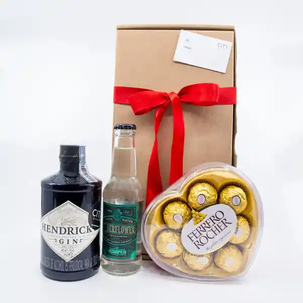 Ginebra Hendricks 375Ml + Chocolate Ferrero Rocher + Tónica Juniper Elderflower + Caja Mediana De Cartón Decorada Con Tarjetica De: Para: . .