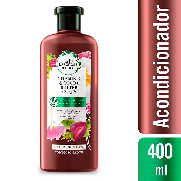 Fortalece y suaviza tu pelo con el acondicionador de Herbal Essences está especialmente inspirado en la naturaleza para brindarle un boost de fortaleza y suavidad a tu pelo, dejándolo limpio, fuerte y renovado. Se habla que la manteca de cacao es un hidratante superior para el pelo y, al igual que la vitamina e, tiene antioxidantes que se dice ayudan a remover los radicales libres previniendo la oxidación acelerada.