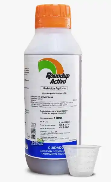 Control efectivo de malezas. - Elimina malezas desde la raíz. (sistémico) - Resultados rápidos y duraderos. - Ideal para agricultura, jardinería y zonas industriales. Roundup Activo 48% (Glifosato) es un herbicida sistémico de amplio espectro, eficaz contra malezas anuales, perennes, gramíneas y de hoja ancha. Penetra por las hojas, llega a la raíz y elimina completamente la maleza. No deja residuos en el suelo, permitiendo nuevas siembras rápidamente. Dosis recomendadas: Cultivos agrícolas: 3 a 5 litros por hectárea. Jardinería y pequeñas extensiones: 150 a 200 ml por bomba de 20 litros ó 10ml de Roundup por litro de agua Zonas industriales o caminos: 5 a 7 litros por hectárea. Recomendaciones de uso: Aplicar en clima seco, sin lluvia en las siguientes horas. Evitar el contacto con cultivos deseados (frutales, ornamentales, etc) Usar protección personal (guantes, gafas, mascarilla). No mezclar con productos no compatibles. Ventajas: - Control total desde la raíz. - Rápida acción. (a los 8 días de haber aplicado el producto empieza a ver cómo la maleza empieza a morir desde la raíz) Compatible con múltiples cultivos y superficies. Seguro para el suelo. (Una vez toca el suelo, el producto se inactiva ya que solo ataca lo que esté verde o contenga clorofila) Descripción del producto: 1 litro de Roundup Activo + INCLUYE tapa dosificadora Producto Original REGISTRO NACIONAL ICA N° 470